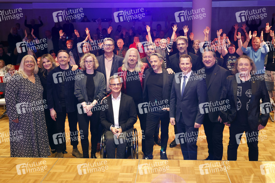 Jana Brandt, Kim Fisher, Denny Niesar, Uta Bretschneider, Andreas Fritsch, Olaf Jacobs, Bernd Römer, Lutz Pehnert, Heiko Jung, Daniel Bätge, Ralf Ludwig, Claudius Dreilich und Martin Becker bei der Preview der MDR-Dokumentation '50 Jahre Karat' im Zeitgeschichtlichen Forum. Leipzig, 25.03.2025