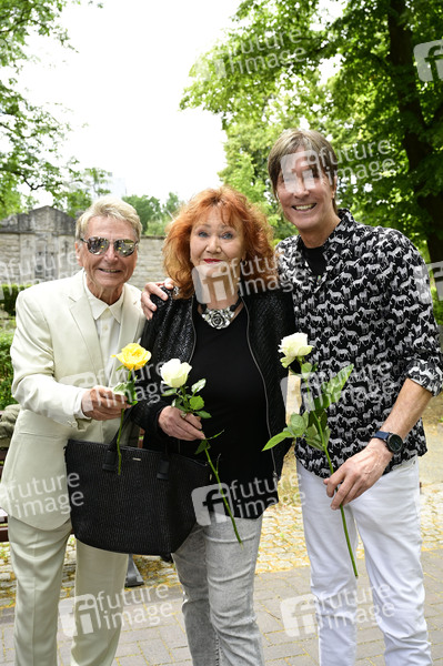 Hans-Jürgen Beyer, Regina Thoss und Rainer Genss bei der Trauerfeier für Urte Blankenstein in der Kapelle des Waldfriedhofs Oberschöneweide. Berlin, 19.06.2025