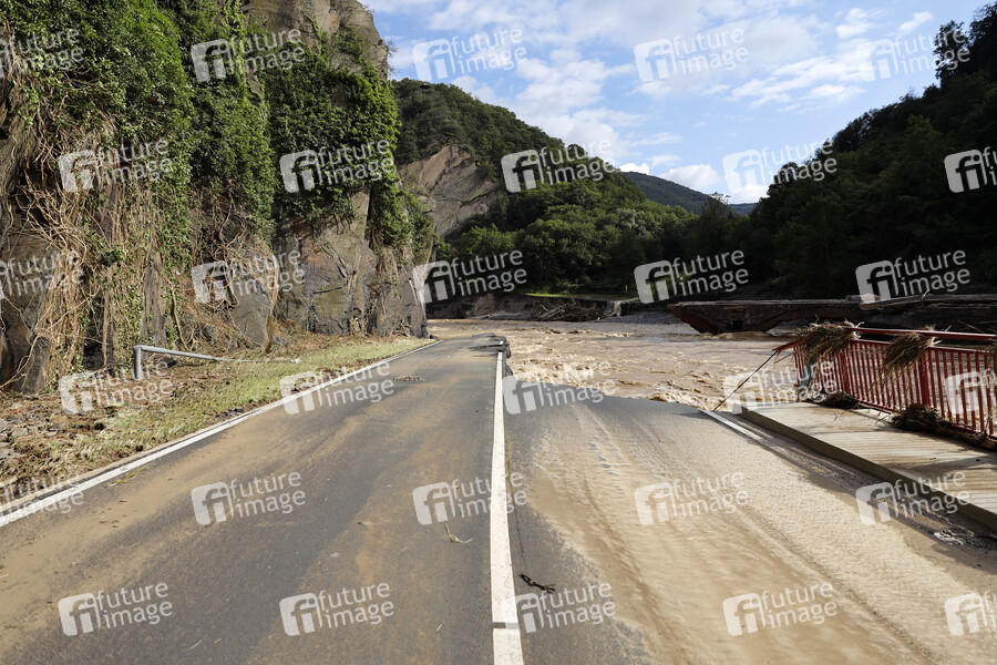 In der Eifel haben heftige Regenfälle und Dauerregen für Überschwemmungen und Überflutungen gesorgt. Im Ahrtal trat der Fluss vielerorts über die Ufer und überschwemmte nicht nur Keller sondern ganze Ortschaften. Im Bild die Straße zwischen Dernau und Walporzheim, die von den Fluten auf einem Abschnitt einfach mitgerissen wurde. Dernau, 15.07.2021