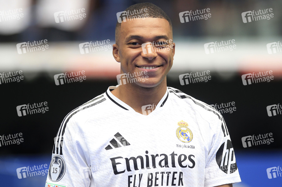 Kylian Mbappe bei der Präsentation als neuer Spieler von Real Madrid im Estadio Santiago Bernabéu. Madrid, 16.07.2024
