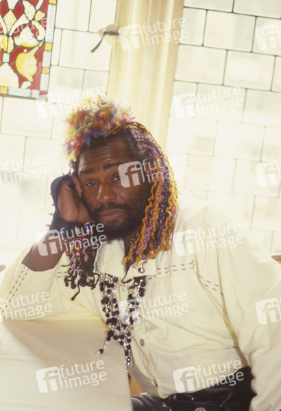 George Clinton von Dolby's Cube bei einem Pressetermin im Belfry Club. London, 04.07.1985