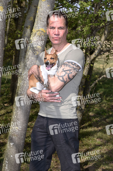 Dave Kaufmann mit seiner Hündin Lieselotte bei einem exklusiven Fototerin während eines Spaziergangs. München, 17.04.2020