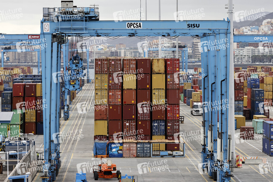 Container, Schiffscontainer, Ware, Waren, Bruttoregistertonne, Bruttoregistertonnen, Warenverkehr, Warenaustausch, Welthandel, Handel, Wirtschaft, Makroökonomie, Schiffsfracht, Fracht, löschen, Einfuhr, Ausfuhr, Import, Export, Zoll, Zölle, Strafzölle, Lieferkette, Lieferketten, Hafen, Handelsroute, Handelsrouten, Importe, Exporte, Exportüberschuss, Importüberschuss, Umschlagshafen, kanarische Inseln, Kanaren, Gran Canaria, ISO-Container, High Cube, Seecontainer, Logistik, Containerkrise, Transport, Transportkosten, globaler Markt, Weltwirtschaft, Hafen, Symbolbild, Symbolfoto