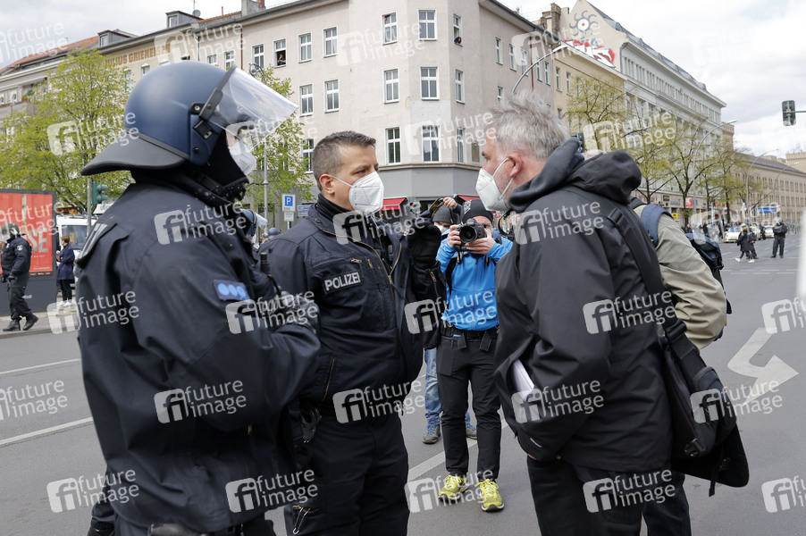 dju-Landesgeschäftsführer Jörg Reichel hat ein Gespräch mit dem Polizeiführer geführt und ihn aufgefordert, mäßigend auf das aggressive Verhalten der Beamten gegen die Presse einzuwirken. Der Polizeiführer bittet um Entschuldigung gegenüber den Journalist*innen. Demonstration in Kreuzberg unter dem Motto 'Generation miteinander - Herzensangelegenheit' aus dem Kreis der Querdenker-Bewegung. Am Rande der Demo kam es zu zahlreichen Gegenprotesten. Berlin, 24.04.2021