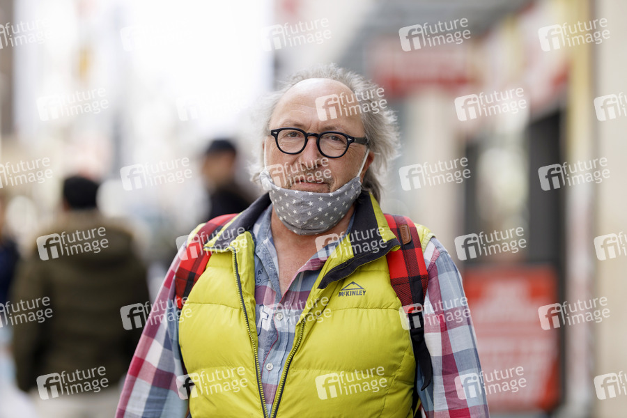Urban Priol posiert mit Mundschutz im Rahmen eines WDR-Interviews auf der Hohe Straße. Köln, 29.04.2020
