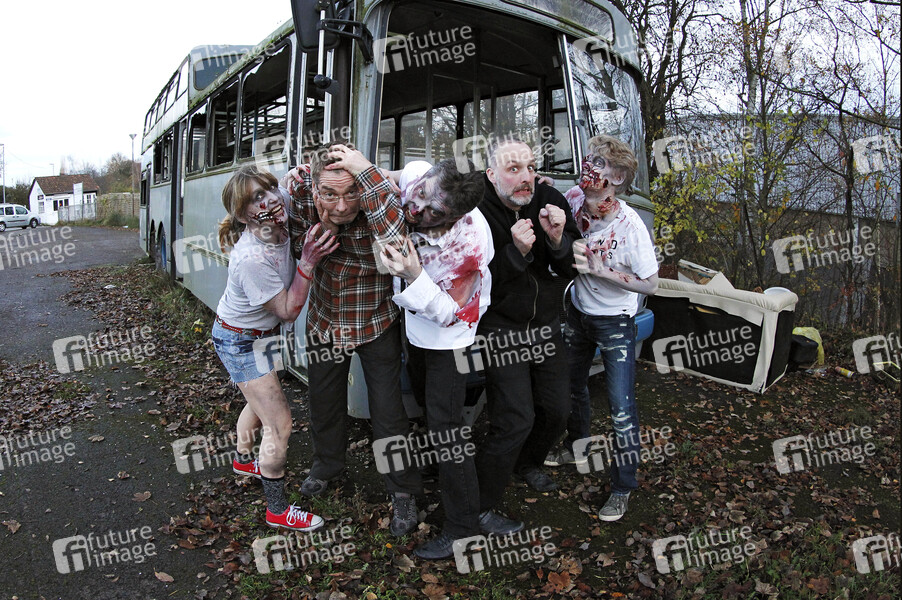 Das Farbkörper-Team Maria Skupin, Tschiponnique Skupin, Enrico Lein und Paul Skupin mit Kollege Jörg Düsterwald bei einem Zombie Photoshooting an einem Buswrack in Rohrsen