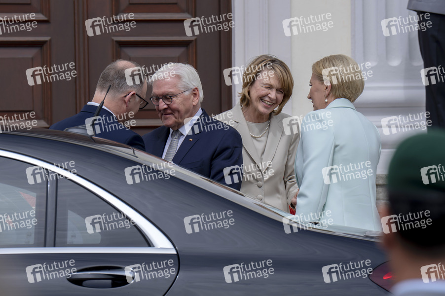 Andrzej Duda, Frank-Walter Steinmeier, Elke Büdenbender und Agata Kornhauser-Duda beim Empfang des polnischen Präsidenten mit militärischen Ehren im Schloss Bellevue. Berlin, 27.05.2025
