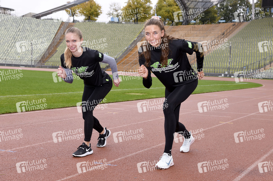 Katharina Trost und Christina Hering beim Fototermin zur sportichen '#WocheChallenge' im Olympiastation München. Unter dem Motto 'Wir können was bewegen!' ruft die Welthungerhilfe zu dieser Challenge auf und bittet um Spenden für eine Welt ohne Hunger. München, 13.10.2020