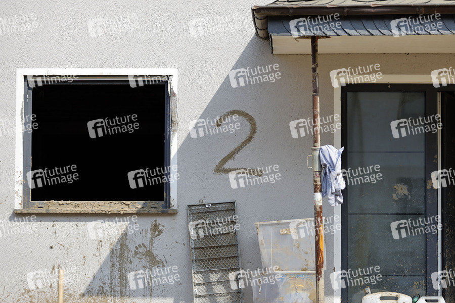 Nach dem Jahrhunderthochwasser in der Eifel durch heftige Regenfälle und Dauerregen mit Überschwemmungen und Überflutungen haben die Aufräumarbeiten im Ahrtal begonnen. Einheiten von Polizei, THW, Bundeswehr und Feuerwehr mitsamt vielen freiwilligen Helfern räumen Straßen, entfernen Schutt und Schlamm und versorgen die Menschen. Im Bild eine mit Schlamm gemalte Hausnummer in der Ortschaft Dernau, in der die Flut viele Häuser zerstörte, 22.07.2021