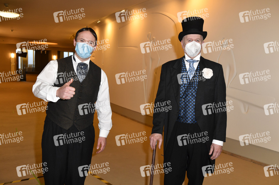 Lorris Andre Blazejewski und Peer Martiny beim Fototermin mit dem (getesteten) Ensemble des Theaterstücks 'Vorhang auf für Cyrano' in Maske und Kostüm vor dem Testzentrum im Schiller Theater. Unter dem Motto 'Testen statt spielen' eröffnen die Komödie am Kurfürstendamm und der KitKatclub ein gemeinsames Testzentrum im Schiller Theater. Berlin, 07.04.2021