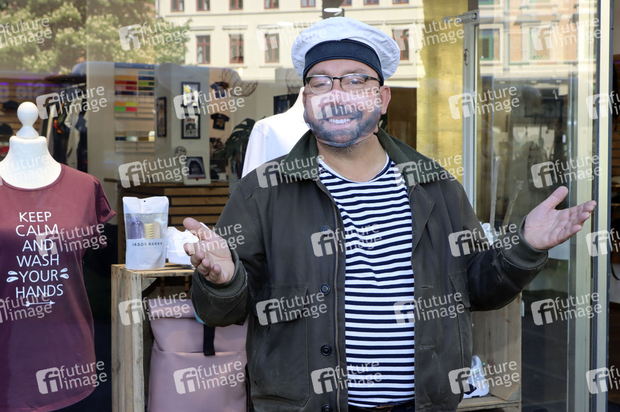 Claas Vogt von Klaus & Klaus beim Fototermin vor der Textildruckerei EINDRUCK, welche Mund-Nase-Masken mit dem echten Lächeln der Träger herstellt. Hamburg, 06.05.2020