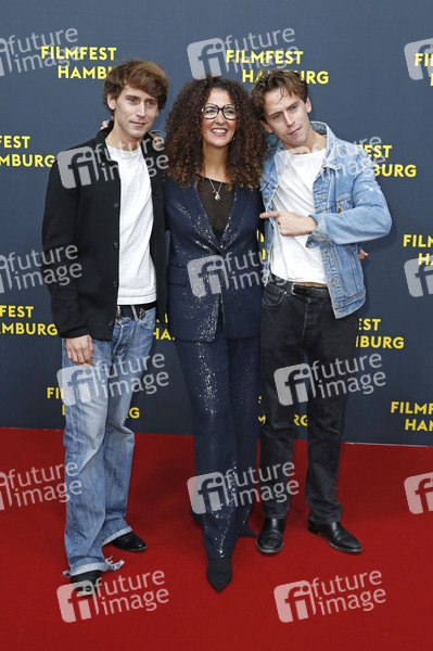 Oskar Belton, Malika Rabahallah und Emil Belton bei der Festivaleröffnung mit der Premiere des Kinofilms 'Lovely Day / Mille secrets, mille dangers' auf dem 33. Filmfest Hamburg 2025 im Cinemaxx Dammtor. Hamburg, 25.09.2025