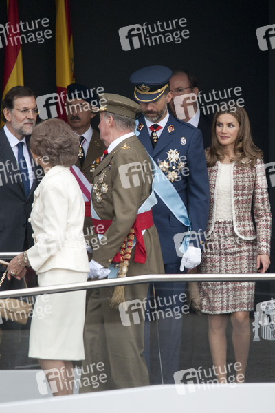 Die spanische Königsfamilie bei der Hommage an die Nationalflagge mit Militärparade am Palacio Real, Madrid