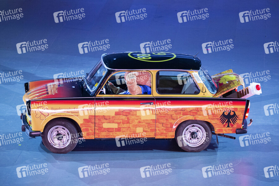 Trabbi 'Willi' und Musikfestmaskottchen Paul beim Musikfest der Bundeswehr, Internationales Militär Tattoo im ISS Dome. Düsseldorf, 21.09.2019