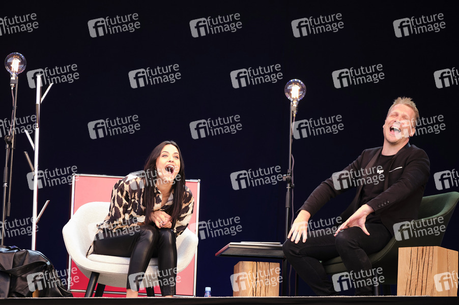 Oliver Pocher mit Ehefrau Amira Pocher bei der ersten Autokultur-Veranstaltung 'Die Pochers hier' auf dem Schützenplatz. Die Besucher verfolgen unter Berücksichtigung klarer Hygiene-Vorschriften während der Corona-Krise den Auftritt aus dem Auto. Hannover, 07.05.2020