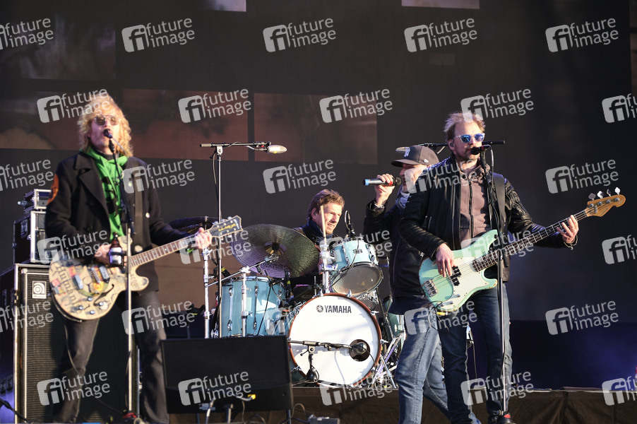 Christof Stein-Schneider, Rainer Schumann, Kai Wingenfelder und Christian Decker von Fury in the Slaughterhouse live beim Autokultur-Konzert auf dem Schützenplatz. Die Besucher verfolgen unter Berücksichtigung klarer Hygiene-Vorschriften während der Corona-Krise den Auftritt aus dem Auto. Hannover, 14.05.2020
