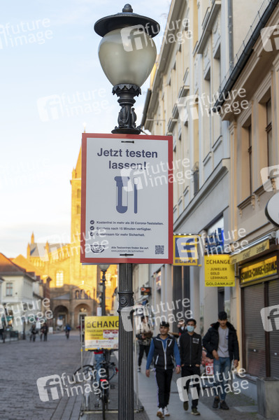 Ein Hinweisschild mit der Aufforderung, sich auf Corona testen zu lassen, hängt in der Fußgängerzone der Flaniermeile Brandenburger Straße. In Potsdam ist das Einkaufen in Verkaufsstellen des Einzelhandels seit Samstag, 27. März 2021, nur noch mit einem aktuellen negativen Corona-Test möglich. (Symbolbild, Themenbild) Potsdam, 29.03.2021