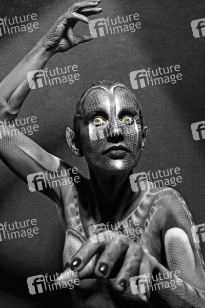 Bodypainting, Erotik, Frau, nackt, drinnen, weiblich, Monster, Außerirdische, Alien, Echse, Körperkunst, Kunst, Malerei, monochrom, erotic, woman, nude, indoor, female, monochrome, lizard, body art, body painting