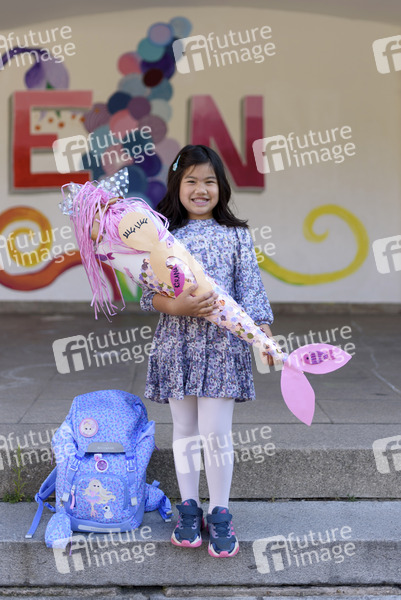 Ein junges Mädchen bekommt zum ersten Schultag bzw. zu ihrer Einschulung in die Grundschule eine Schultüte. (Model Release, Themenbild, Symbolbild) Nürnberg, 15.09.2021