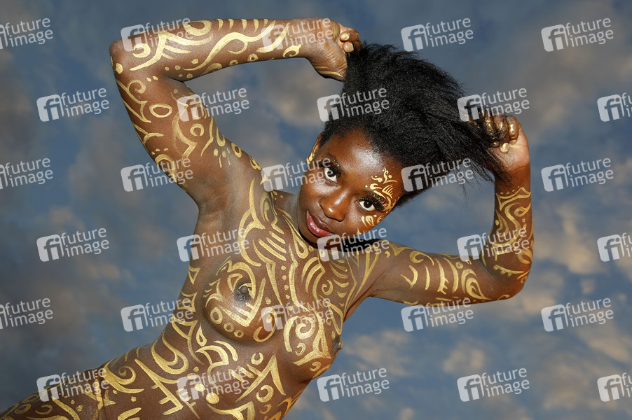 Bodypainting, Erotik, Frau, Mädchen, Afrikanerien, nackt, draußen, weiblich, Körperkunst, Kunst, Ornamente, Malerei, Feld, Acker, Stoppelfeld, Heuballen, Stroh, Landwirtschaft, Ernte, Abendsonne, erotic, African woman, girl, nude, outdoor, female, body art, body painting, ornaments, field, hay, straw, farming, harvest, evening sun