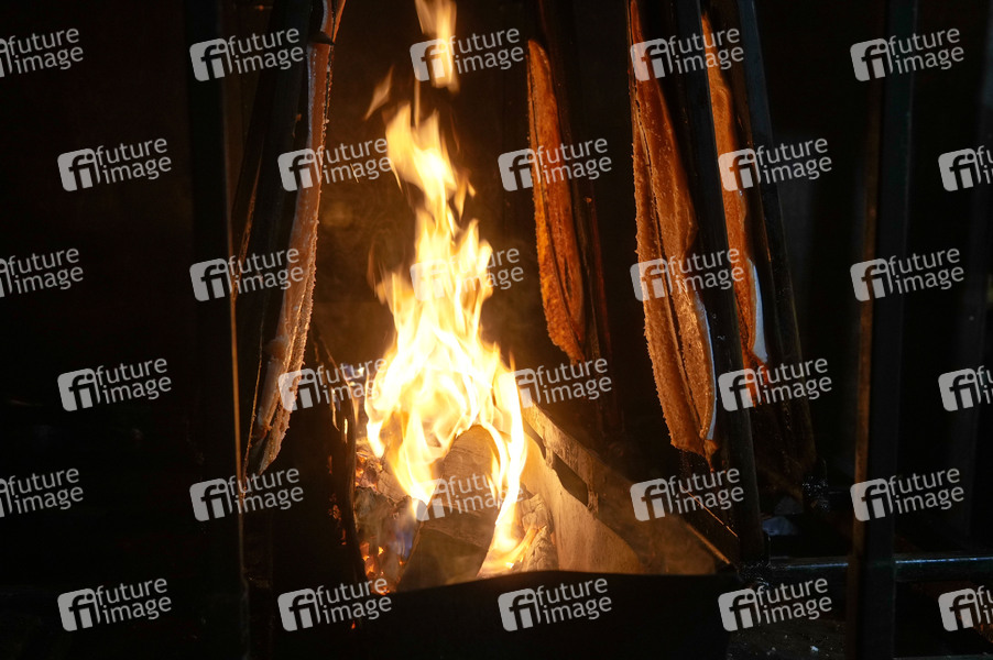 Lachs wird am offenen Feuer gegrillt auf dem Lucia Weihnachtsmarkt in der Kulturbrauerei. Berlin, 21.12.2024