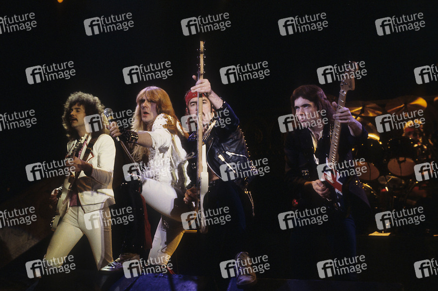 Graham Oliver, Biff Byford, Steve Dawson, Paul Quinn und Nigel Glockler von Saxon live im Hammersmith Odeon. London, 18.09.1984