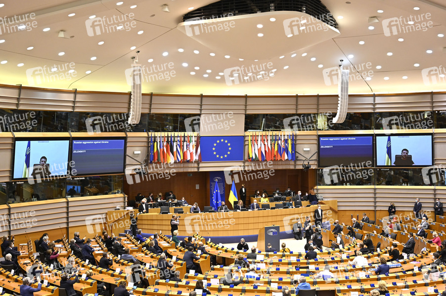 Rede, außerordentliche Sitzung, Politik, Europaparlament, EU-Parlament, EP, Parlament der Europäischen Union, Parlamentum Europaeum, MdEP, Mitglied des Europäischen Parlaments, Krieg, Angriffskrieg, Einmarsch, Europapolitik, internationale Krise, internationale Politik, internationales Recht, Konflikt, Krieg, Kriegsbeginn, Kriegsverbrechen, Krise, Militäroffensive, Militärschlag, Sanktionen, Solidarität, Solidaritätsbekundung, Ukraine, Ukrainekonflikt, Ukraine-Konflikt, Ukrainekrise, Ukraine-Russland-Krise, Politiker, Wolodymyr Selenskyj, Schauspieler, Regisseur, Monderator, Produzent, Präsident der Ukraine