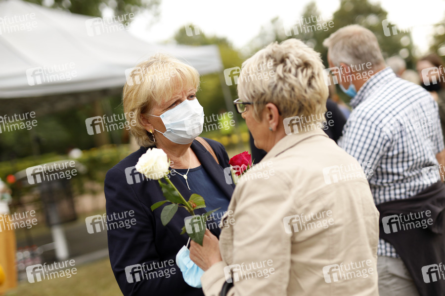 Hannelore Kraft spricht mit Angehörigen der Opfer auf der Gedenkfeier zum 10. Jahrestag der Loveparade Katastrophe, bei der 21 Menschen starben. Duisburg, 24.07.2020