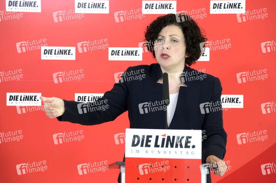 Politik, Pressekonferenz, Pressestatement, PK, Reichstag, Deutscher Bundestag, Demokratie, Abgeordnete, Parlament, Parlamentsgebäude, Volksvertreter, MdB, Mitglied des Bundestages, Politikerin, Die Linke, Fraktionsvorsitzende der Linken im Bundestag