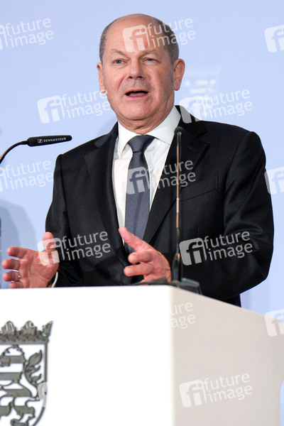 Olaf Scholz bei der Pressekonferenz zur Ministerpräsidentenkonferenz zur Flüchtlingspolitik von Bund und Ländern in der Vertretung des Landes Hessen beim Bund. Berlin, 06.03.2024