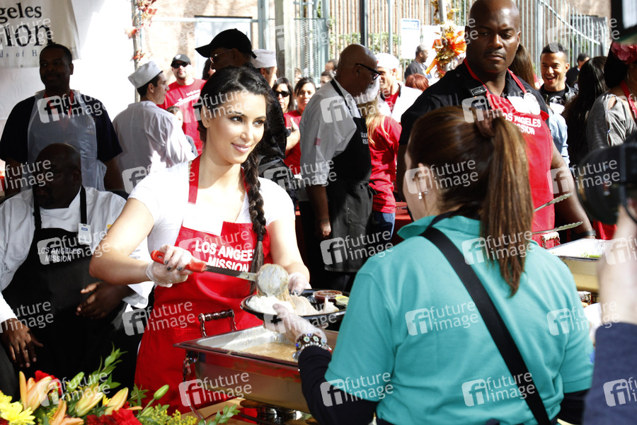 Prominente servieren Obdachlosen eine traditionelle Thanksgiving Mahlzeit zum 75. Geburtstag der Los Angeles Mission, Los Angeles, Kalifornien