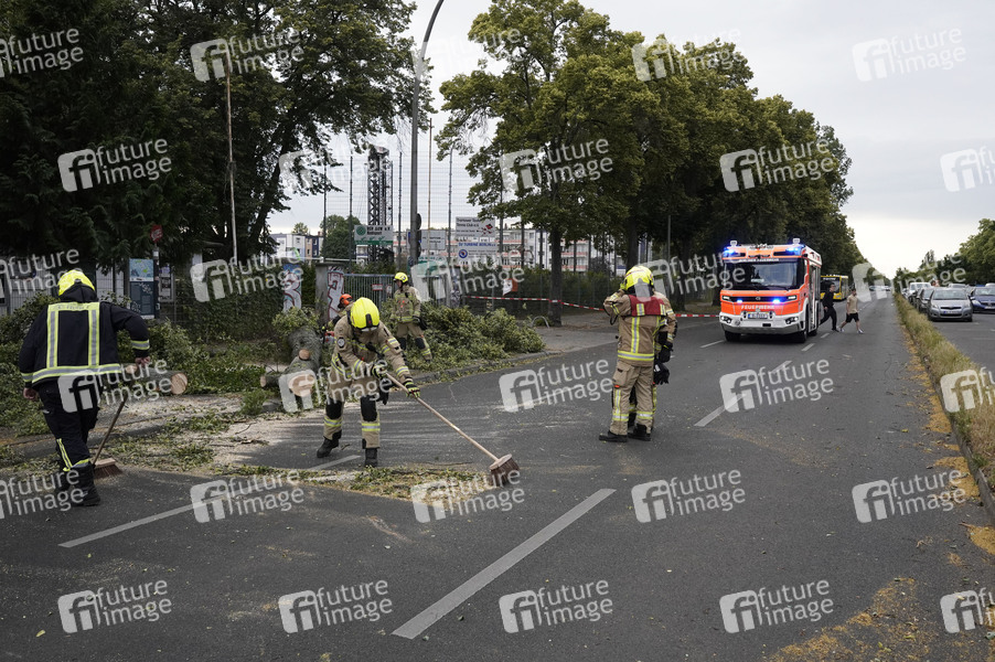 Am Eingang des Willy Sänger Sportplatz wurde durch eine Sturmböhe eine alte Eiche auf die Fahrbahn der Köpenicker Landstraße gelegt. Die Berliner Feuerwehr beseitigt den Baum. Berlin, 23.06.2025