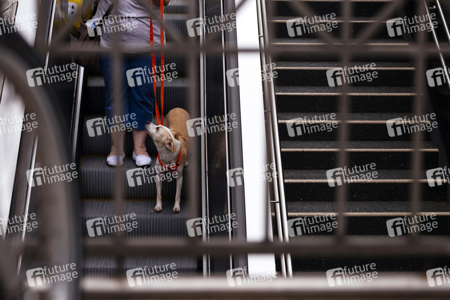 Ein Hund schaut auf einer Rolltreppe ängstlich zu seiner Herrin. Köln, 19.05.2020