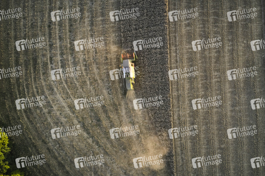 Luftbild, Luftaufnahme, Mähdrescher, Erntemaschine, Korn, Kornfeld, Vollkorn, Ähren, Halme, Feld, Landwirtschaft, Dürre, Trockenheit, Wasser, Regen, Grundwasser, Wasserknappheit, Grundwasserspiegel, Grundwasserpegel, Trockenphase, Ernte, Ernten, Getreide, Landwirte, Bauern, Acker, Äcker, Weizen, Gerste, Roggen, Wheat, Rye, Barley, Körner, Triticale, Anbau, Bio, Dünger, Agrar, Agrarwirtschaft, Erntewetter, Ernteausfall, Ernteausfälle, Futterkrise, Missernte, Futter, Saat, Saatgut, Anbau, Fruchtbarkeit, Bauern, Bauernverband, Symbolbild, Symbolfoto
