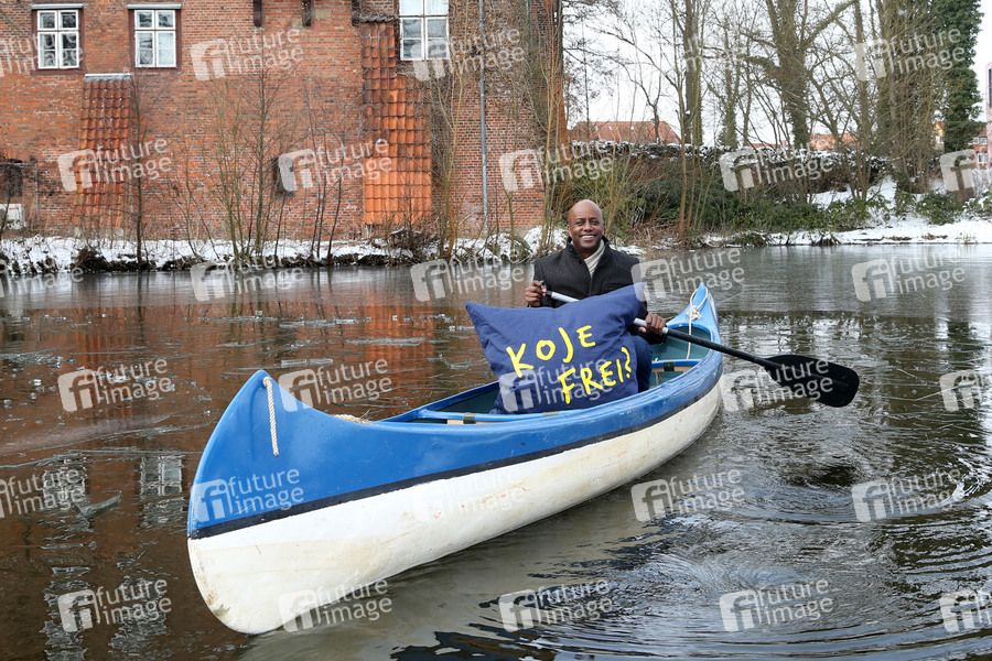 Yared Dibaba paddelt auf dem Schloßteich für die Aktion 'Koje frei?' um für Unterkünfte für Teinehmer der Kirchentags zu werben. Winsen an der Luhe, 13.03.2013
