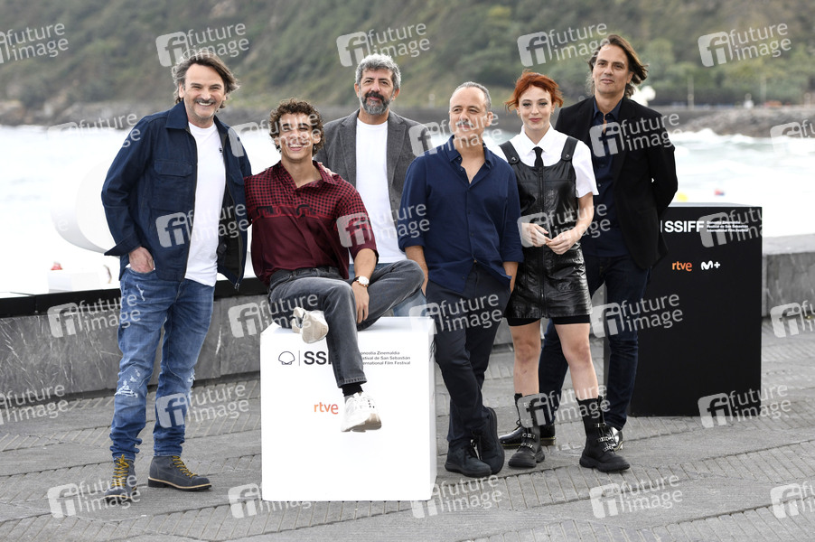 Miguel Herran, Javier Gutierrez, Fernando Tejero, Alberto Rodriguez, Catalina Sopelana und Rafael Cobos beim Photocall zum Kinofilm 'Modelo 77' auf dem 70. Internationalen Filmfestival San Sebastian / Festival Internacional de Cine de San Sebastián auf der Kursaal Terasse. San Sebastian, 16.09.2022
