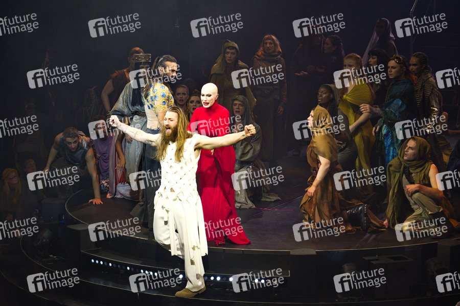 Sasha Di Capri, John Arthur Greene und Ilay Bal Arslan bei der Fotoprobe der Rockoper 'Jesus Christ Superstar' in der Komischen Oper im Hangar 4 des Flughafens Tempelhof. Berlin, 17.09.2025