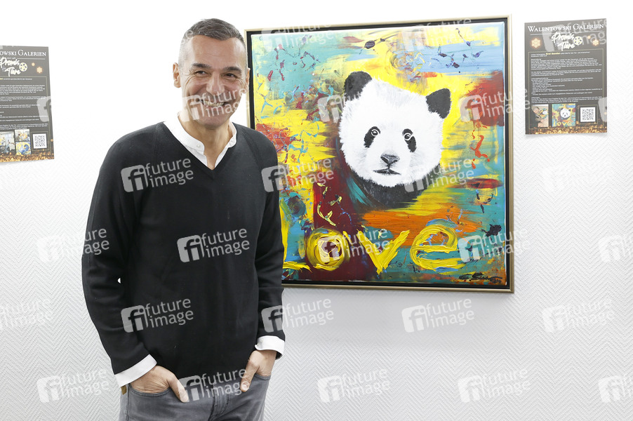 Erol Sander mit seinem Bild beim Start der zweiten Kunst-Aktion 'Art'n'Schutz' zugunsten des Tier- und Artenschutzes mit einer Vernissage mit Bildern bedrohter Tiere gemalt von Promis in der Galerie Walentowski. Werl, 23.11.2024