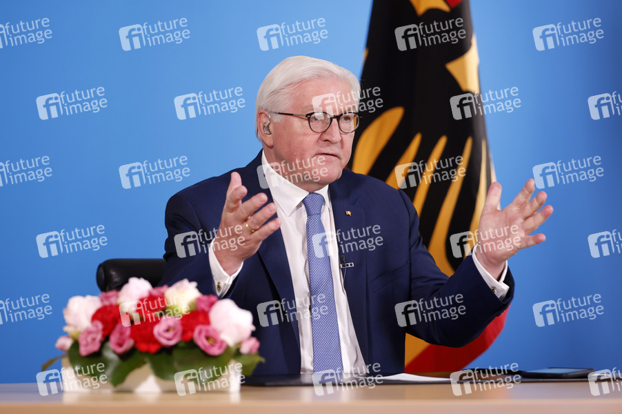 Frank-Walter Steinmeier bei der Vorstellung eines Kurzfilms über die Villa Hammerschmidt in Bonn und anschließendem Videogespräch mit der Bonner Oberbürgermeisterin Katja Dörner und dem Präsidenten der Stiftung Haus der Geschichte, Hans Walter Hütter, im Schloss Bellevue. Berlin, 01.06.2021