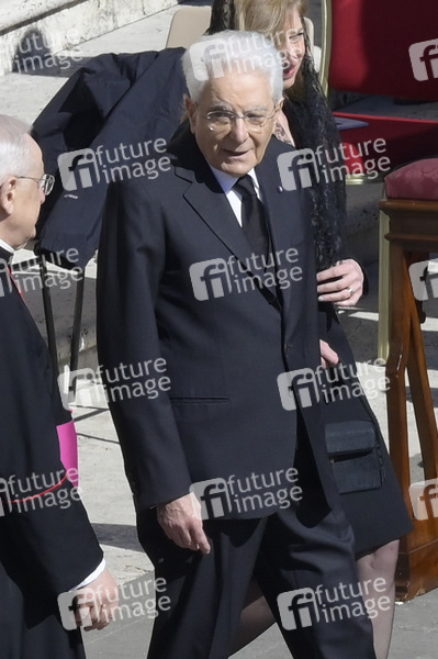 Sergio Mattarella bei der Trauermesse für den verstorbenen Papst Franziskus auf dem Petersplatz. Vatikanstadt, 26.04.2025