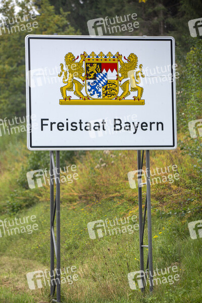 Autobahnschild, Autobahntafel, Bundesstraßenschild, Bundesstraßentafel, Hinweistafel, Information, Landesgrenze, Landeswappen, National Border, Straßenschild, Verkehrsschild, Wappen, Willkommenstafel, Willkommensschild, Staatswappen, Volkskrone, Staatswappen, Wappenelemente, Großes Staatswappen, rotbewehrter Löwe, Fränkischer Rechen, Blauer Panther, Drei schwarze Löwen, Weiß-blaues Herzschild, Symbolbild, Themenbild
