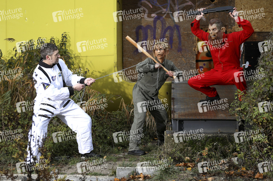 Bodypainting, Body-Painting, Körperkunst, Körperfarben, Farbe, Bemalung, Make-up, Kunst, Malerei, Dystopie, Science Fiction, Affen, Affe, Schimpanse, Schimpansen, Waffe, Waffen, Gewehr, Pumpgun, Basballschläger, Astronaut, Raumfahrer, body painting, body art, colors, dystopia, monkeys, monkey, chimp, chimpanzee, chimps, chimpanzees, weapon, gun, rifle, pump gun, baseball bat