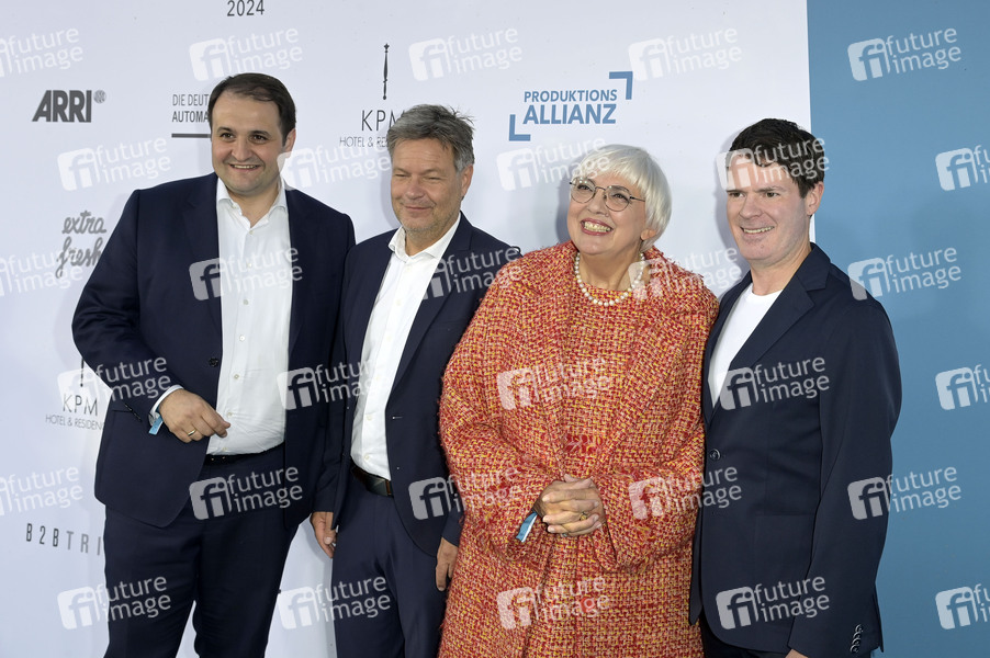 Nathanael Liminski, Robert Habeck, Claudia Roth und Björn Böhning beim Fest der Produktionsallianz 2024 im Tipi am Kanzleramt. Berlin, 13.06.2024