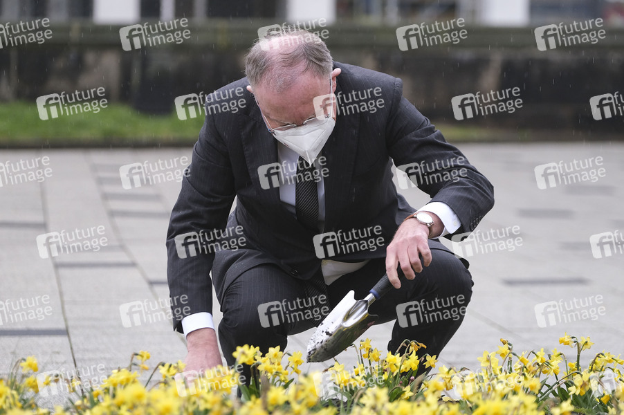 Stephan Weil pflanzt Blumen für Corona-Opfer bei einer Gedenkzeremonie für die Verstorbenen in der Corona-Pandemie vor der Nikolaikapelle an der Goseriede. Hannover, 18.04.2021