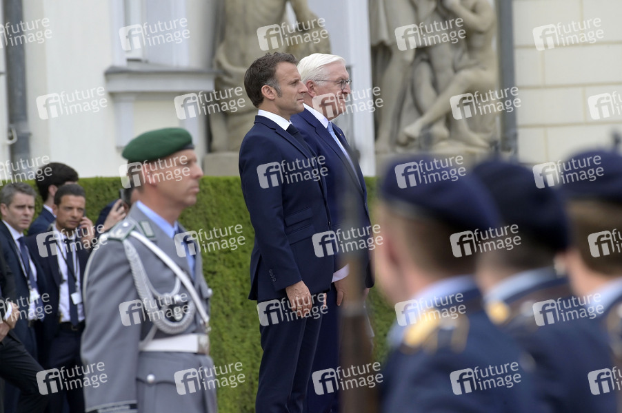 Emmanuel Macron und Frank-Walter Steinmeier beim Empfang des Staatspräsidenten der Französischen Republik mit militärischen Ehren im Schloss Bellevue. Berlin, 26.05.2024