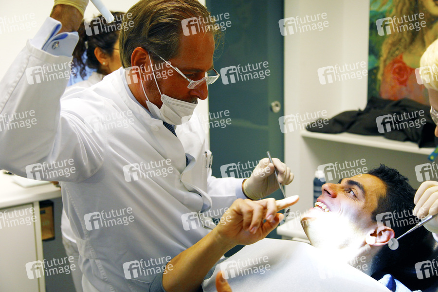 Vor seiner Abreise ins Dschungelcamp lässt sich Silva Gonzalez in der Praxis Dentalspecialists von Prof. Dr. Martin Joergens, Prof. Dr. Martin Wainwright und Dr. Caroline Kentsch zahnärztlich untersuchen, Düsseldorf
