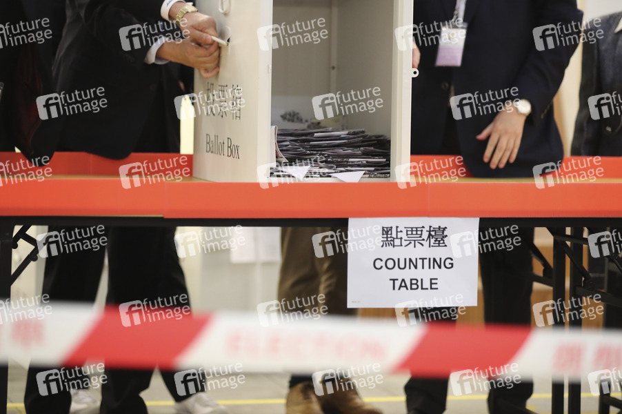 Die Wahlurne ist für die Auszählung von Stimmen geöffnet - Gewaltloses Wochenende in Hongkong. Fast 3 Millionen Hongkonger Bürger haben im Rahmen eines Referendums ihre Stimme abgegeben. Die Wahlbeteiligung wurde mit 71,2% von 4,1 Millionen Wahlberechtigten bestätigt. Es wird als Stimmungsbarometer zwischen dem Pro-Demokratie-Lager und dem Pro-Peking-Lager nach mehr als fünf Monaten des Aufruhrs in der Stadt angesehen. Das demokratische Lager in Hongkong hat bei den Bezirkswahlen einen klaren Sieg errungen. Hongkong, 24.11.2019