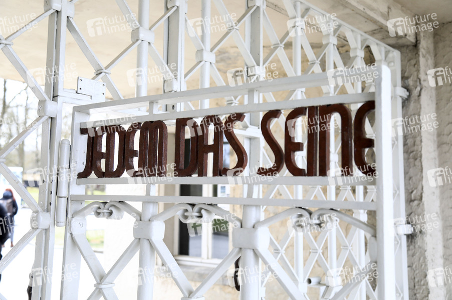 'Jedem das Seine' steht am Eingangstor des ehemaligen Konzentrationslagers Buchenwald, aufgenommen bei der Kranzniederlegung zum 80. Jahrestag der Befreiung des Konzentrationslagers Buchenwald und Mittelbau-Dora. Weimar, 06.04.2025