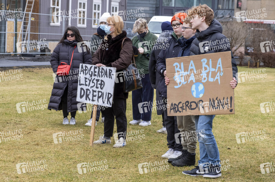 Nur wenige Schüler und Studenten versammeln sich zum Global Climate Strike der Bewegung Fridays For Future vor dem Parlamentsgebäude. Ein Teil der Protestaktion findest auch online statt. Reykjavik, 19.03.2021