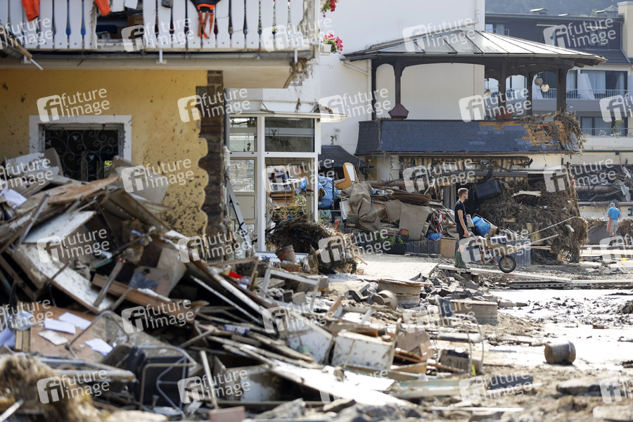 Nach dem Jahrhunderthochwasser in der Eifel durch heftige Regenfälle und Dauerregen mit Überschwemmungen und Überflutungen haben die Aufräumarbeiten im Ahrtal begonnen. Einheiten von Polizei, THW, Bundeswehr und Feuerwehr mitsamt vielen freiwilligen Helfern räumen Straßen, entfernen Schutt und Schlamm und versorgen die Menschen. Im Bild zerstörte Häuser in der Ortschaft Altenahr, in der die Flut viele Häuser zerstörte, 22.07.2021